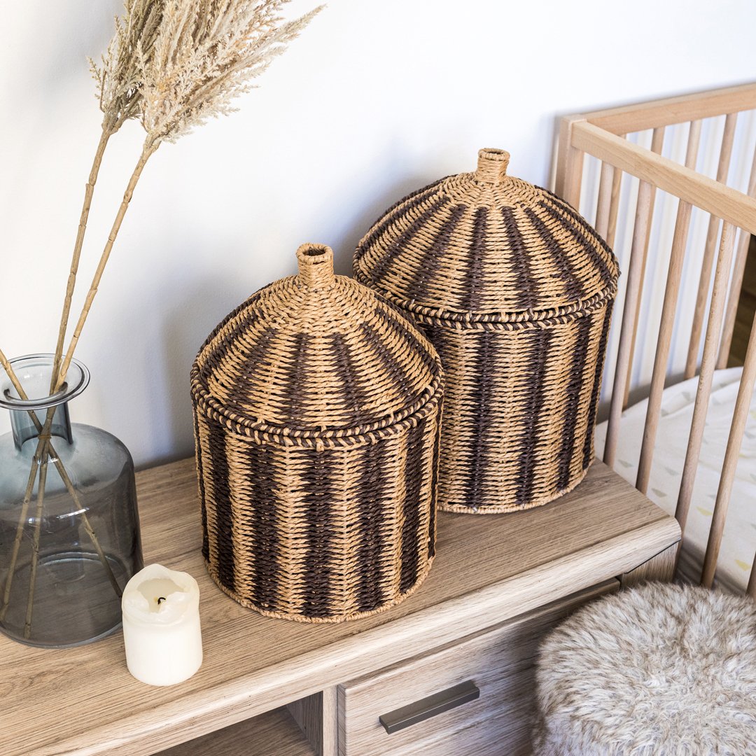 Opdag vores to smukke og praktiske opbevaringskurve med låg, designet specielt til børneværelset af Olsen Home.
